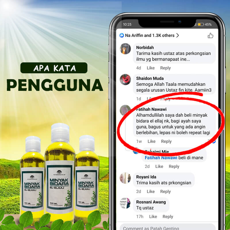 Alhamdulillah saya dah beli minyak bidara El Ellah nak bagi ayah saya guna, bagus untuk yang ada angin berlebihan, lepas ni boleh repeat lagi.